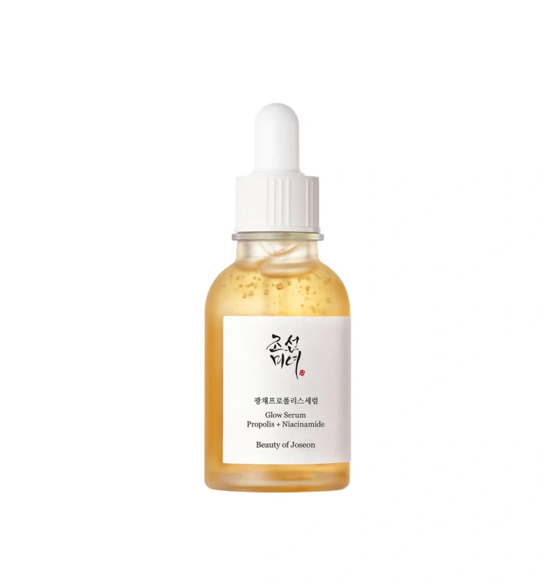 Beauty of Joseon - Glow Serum Propolis a Niacinamide - rozjasňující sérum na obličej, které zesvětluje pigmentové skvrny, redukuje zarudnutí a navrací pleti její přirozený lesk. Na bázi extraktu z propolisu (v koncentraci 60 %), který urychluje přirozený proces regenerace a stanovuje efektivní základ pro ostatní aktivní složky: niacinamid v koncentraci 2 % a derivát kyseliny salicylové – ? betain salicylát v koncentraci 0,5 %, které čistí ucpané póry, regulují práci mazových žláz, snižují nadměrnou sekreci kožního mazu a předcházejí vzniku nedokonalostí. Přípravek byl obohacen o množství rostlinných extraktů. Produkt na bázi složek přírodního původu.