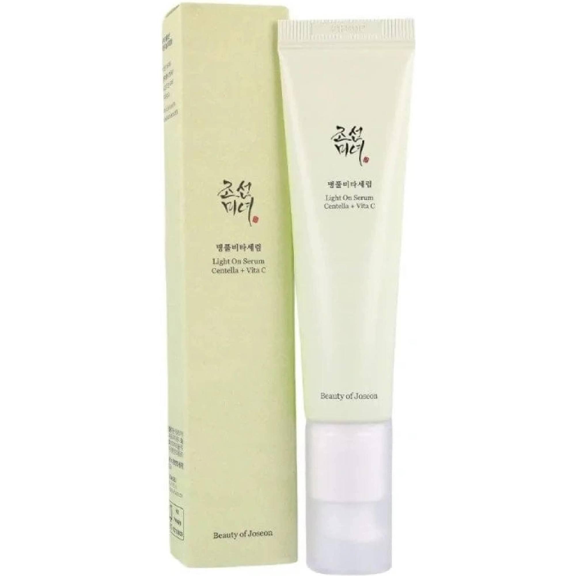 Beauty of Joseon - Light On Serum - Centella + Vita C - lehké sérum na obličej. Složení přípravku tvoří 68% extrakt z pupečníku asijského, který je známý svými protizánětlivými, uklidňujícími a regeneraci urychlujícími vlastnostmi. Součástí složení je i stabilní forma vitamínu C, t. j. kyselina 3-O-ethylaskorbová, která má ve srovnání s jinými deriváty vysokou afinitu k pokožce, takže nezanechává podráždění a rychle se vstřebává. Poskytuje rozjasňující a antioxidační účinek a dodává pleti krásný lesk. Doplňují jej hydratační složky, jako jsou betain, kyselina hyaluronová a beta-glukan, které zanechávají pokožku jemnou a pružnou.